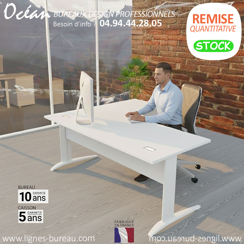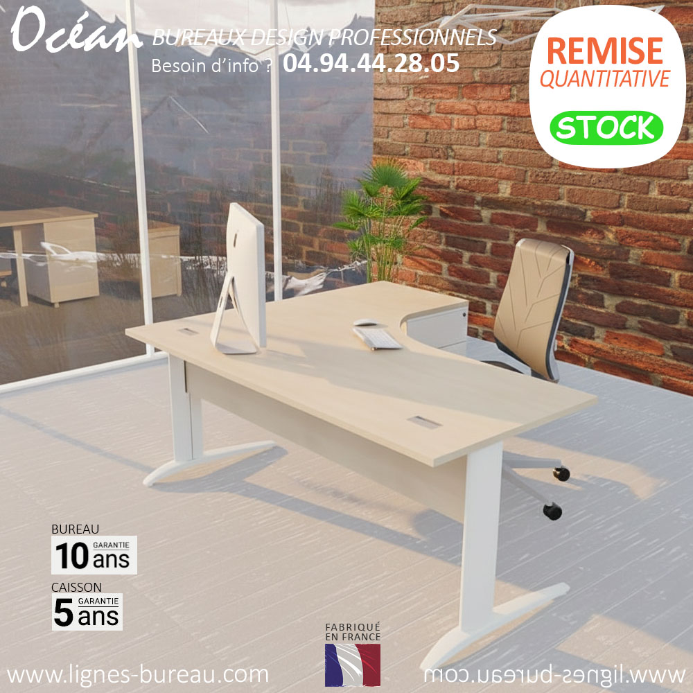 Mais si vous souhaitez des extensions frontales ou une demi lune de bout de bureau, la gamme Océan vous le permet. C'est une solution pour disposer d'un espace supplémentaire pour recevoir des visiteurs, sans empiéter sur votre plan de travail principal. La rubrique des produits complémentaires ci-dessous vous propose ce type de mobilier, que vous retrouvez aussi dans le catalogue téléchargeable.