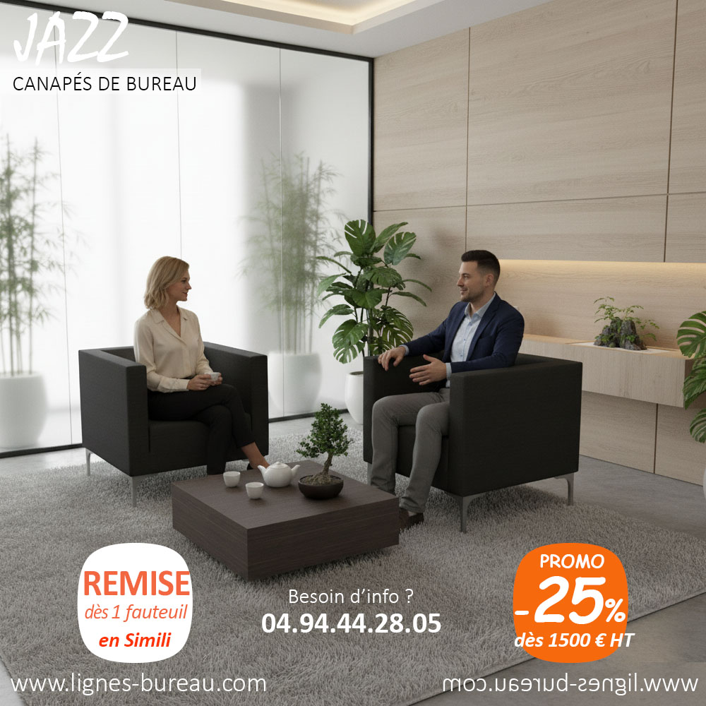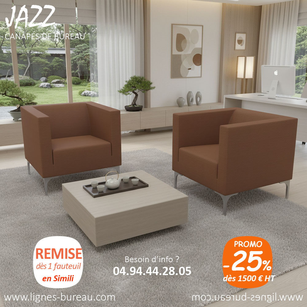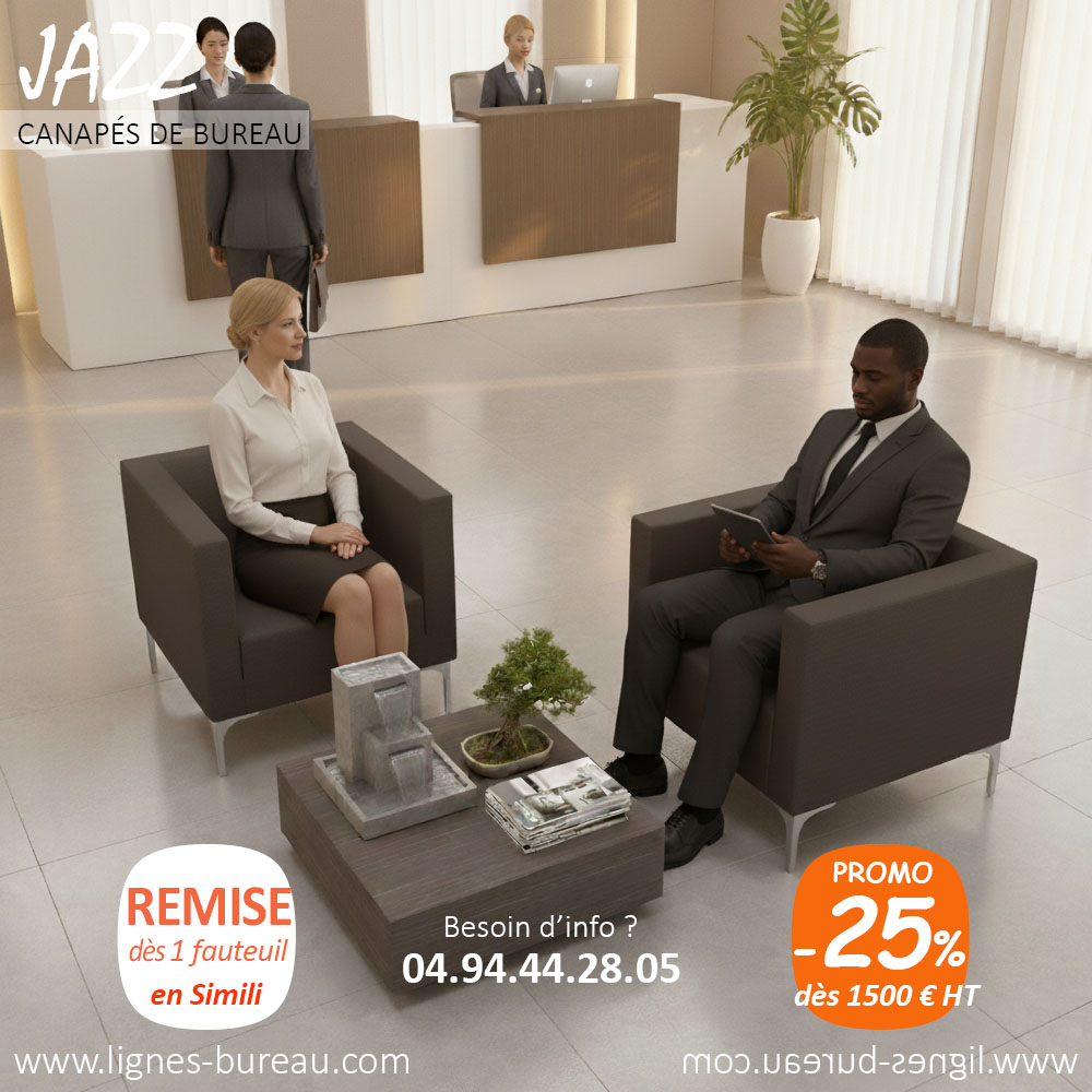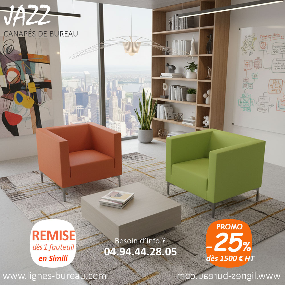 L'achat de ces fauteuils canapés 1 place de bureau pas cher de la gamme jazz, vous permet de compléter le canapé 2 ou 3 places de la même collection, en bénéficiant d'une remise de 18 % dès l’achat d’un seul fauteuil en similicuir ou de 25 % à partir de 1500 € HT de commande. Les lots de 2 fauteuils pour salle d attente proposés en variante vous permettent de bénéficier de 25 % de promotion avec la version en Simili cuir et de 27 % avec la version en cuir. Avec ce type de canapé individuel de la gamme Jazz, vous disposez d’un design intemporel pour réussir des espaces d’attente ou des salons de direction luxueux, modernes ou classiques.